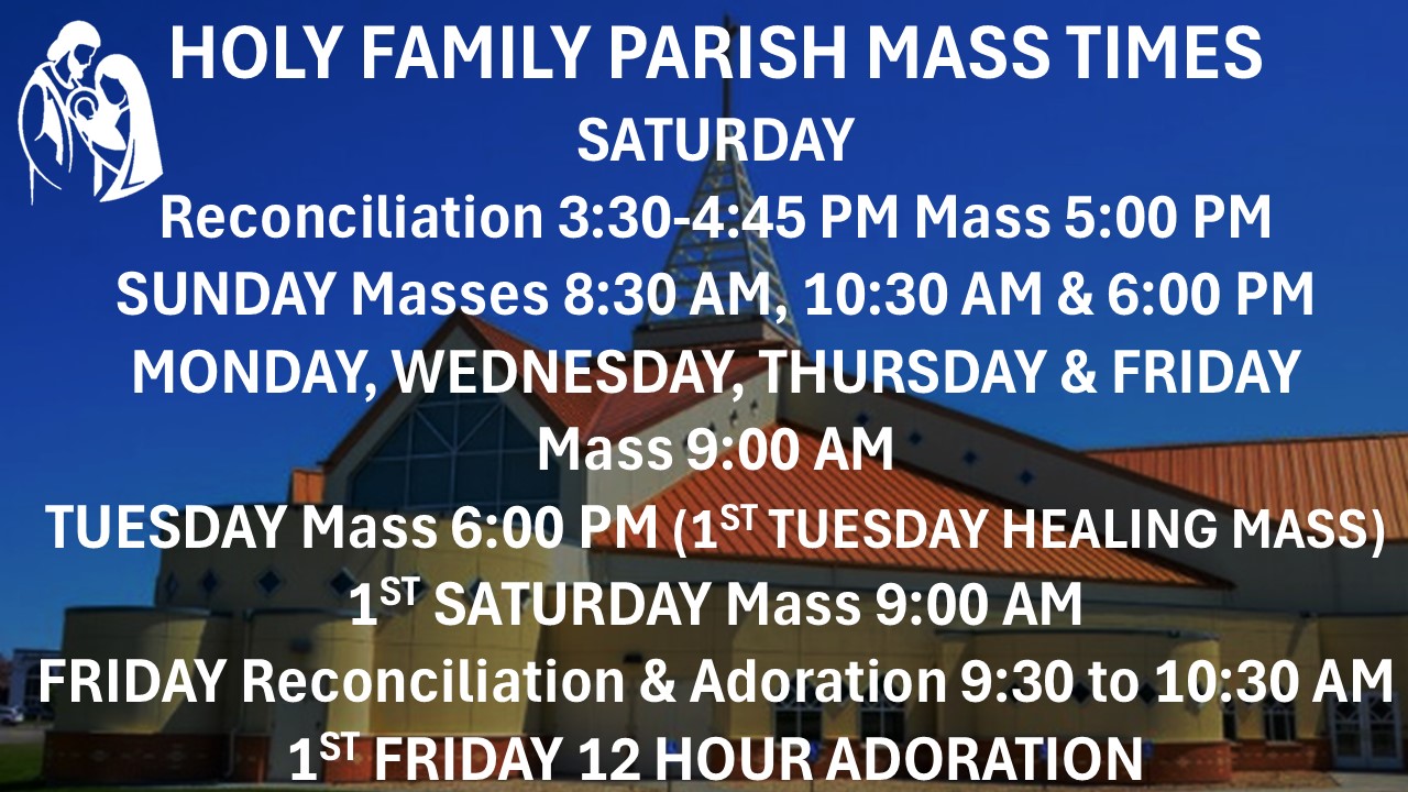 Holy Family Parish is a welcoming community of faith, called together by Christ’s love, and strengthened by the Holy Spirit, the Word and the Sacraments.